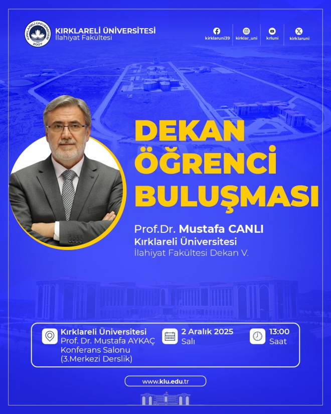 ![]() | REKTÖRÜMÜZ PROF.DR. RENGİN AK' DAN DEKANIMIZA ZİYARET 07/11/2025 99 Okunma 6 Kasım 2025 Perşembe günü saat 15.30’da İlahiyat Fakültesi toplantı salonunda Üniversitemiz Yönetim... |