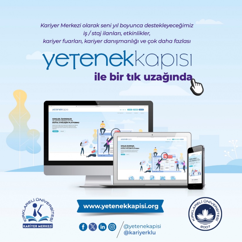 Kariyer yolcuğun için önemli bir adım atmak ister misin? Güncel iş / staj ilanları, etkinlikler ve kariyer danışmanlığı hizmeti gibi çok sayıda fırsatlar içeren Yetenek Kapısı ile kariyer yolculuğu artık daha keyifli! Cumhurbaşkanlığı Yetenek Kapısı Kariyer Platformu’nun (www.yetenekkapisi.org) sayfasında gerekli bilgilere ulaşabilirsiniz.