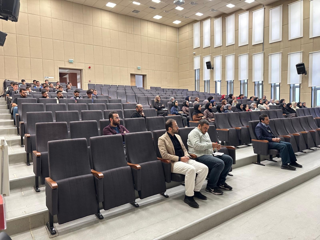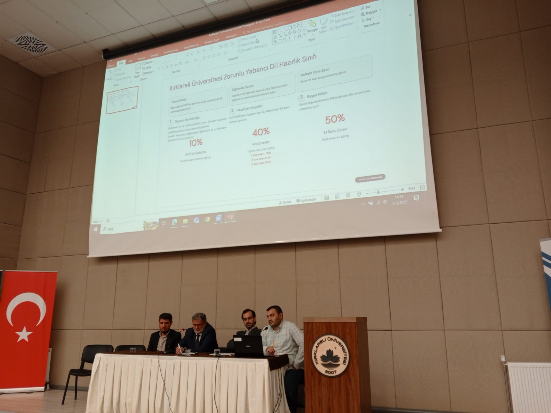 Ardından, Fakülte Sekreterimiz Ertuğrul Ceylan, öğrencilerimizin kampüs yaşamına uyum sağlamaları için bina tanıtımı, idari birimler, sağlık, beslenme, barınma, ulaşım ve sosyo-kültürel etkinliklere erişim yolları hakkında detaylı bir sunum yaptı.