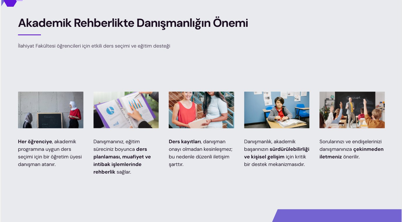 Eğitim hayatınız boyunca akademik süreçlerinize rehberlik ederek sizlere yardımcı olacak danışman hocalarınızla mutlaka tanışıp danışmanlık gün ve saatlerinde kendilerini ziyaret etmenizi öneririz. Danışman hocalarınızın öneri ve tavsiyeleriyle hareket etmeniz sizlerin eğitim hayatını kolaylaştırılacak ve ileride ilan edilecek tarihlerde danışman hocalarınızın yapacağı tanışma ve bilgilendirme toplantılarına mutlaka katılmalısınız.