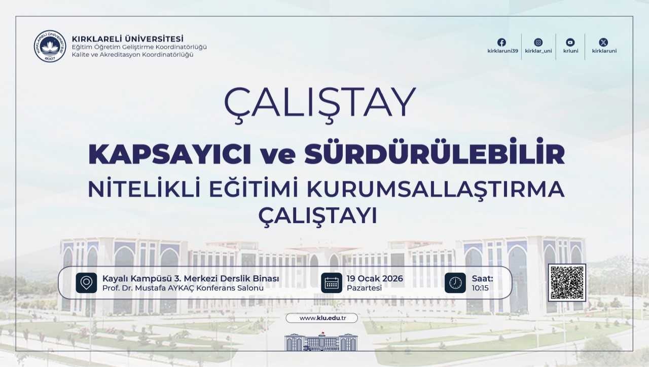 Üniversitemizde kurumsal eğitim kalite güvencesi yaklaşımının güçlendirilmesi ve programlarda yürütülen akreditasyon ve özdeğerlendirme çalışmalarının kurumsal bütünlük içerisinde değerlendirilmesi amacıyla 19 Ocak Pazartesi günü Saat 10.15'te, Prof. Dr. Mustafa Aykaç Konferans Salonunda Rektörümüz Prof. Dr. Rengin AK'ın katılımıyla “Kapsayıcı ve Sürdürülebilir Nitelikli Eğitimi Kurumsallaştırma Çalıştayı” düzenlenecektir.