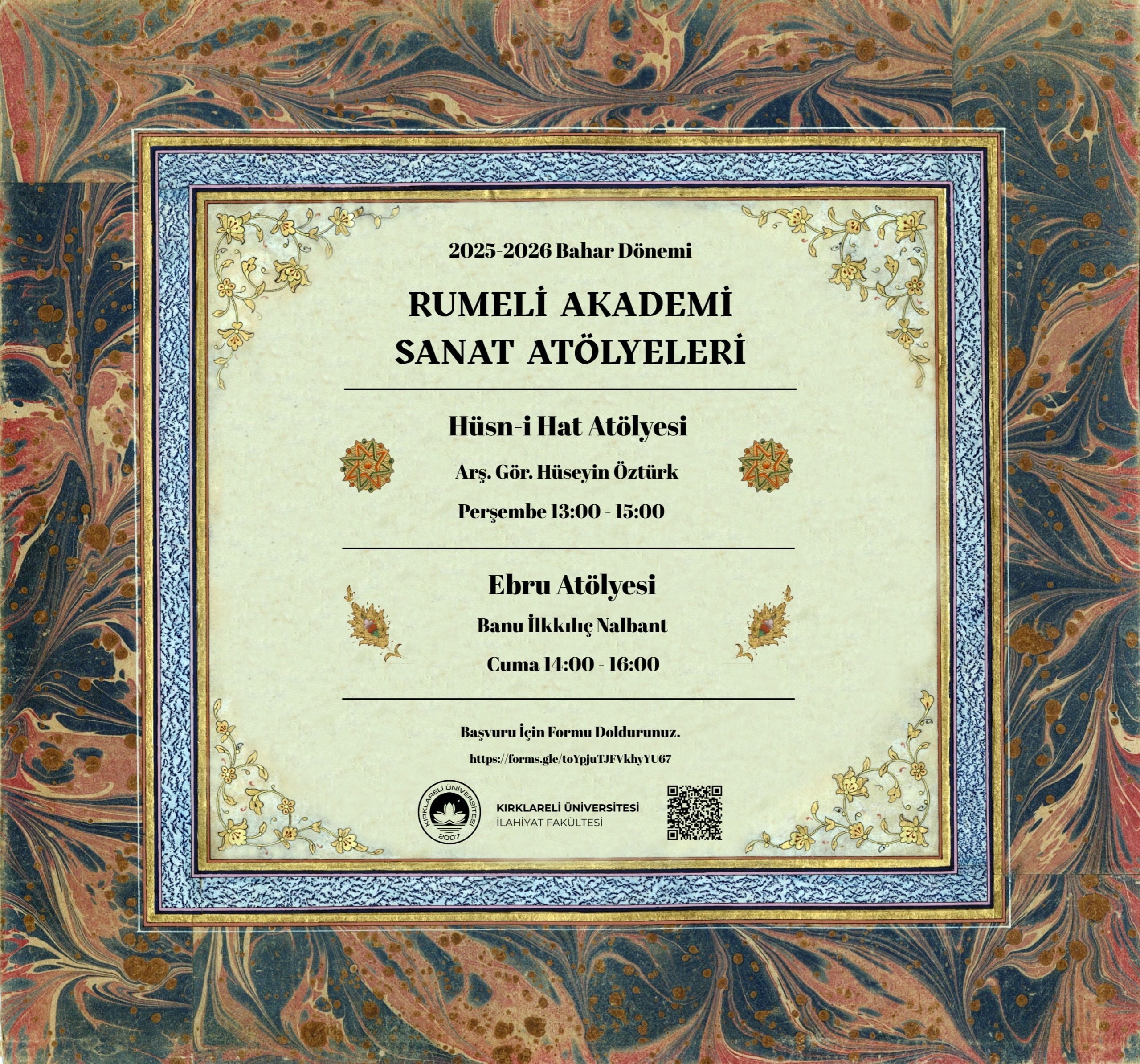 Kırklareli Üniversitesi İlahiyat Fakültesi bünyesinde yürütülen Rumeli Akademi Sanat Atölyeleri kapsamında; 2025-2026 Akademik Yılı Bahar Dönemi'nde gelenekli sanatlarımızın tanıtılması amacıyla Hüsn-i Hat ve Ebru atölyeleri düzenlenecektir. Program dâhilinde öğrencilerimiz; Fakültemiz Türk İslam Sanatları ve Tarihi Bölümü Araştırma Görevlisi Hüseyin Öztürk ile Ebrucu Banu İlkkılıç Nalbant’ın rehberliğinde, bu kadim sanat dallarının estetik inceliklerini bizzat tecrübe ederek öğrenme fırsatı yakalayacaklardır.