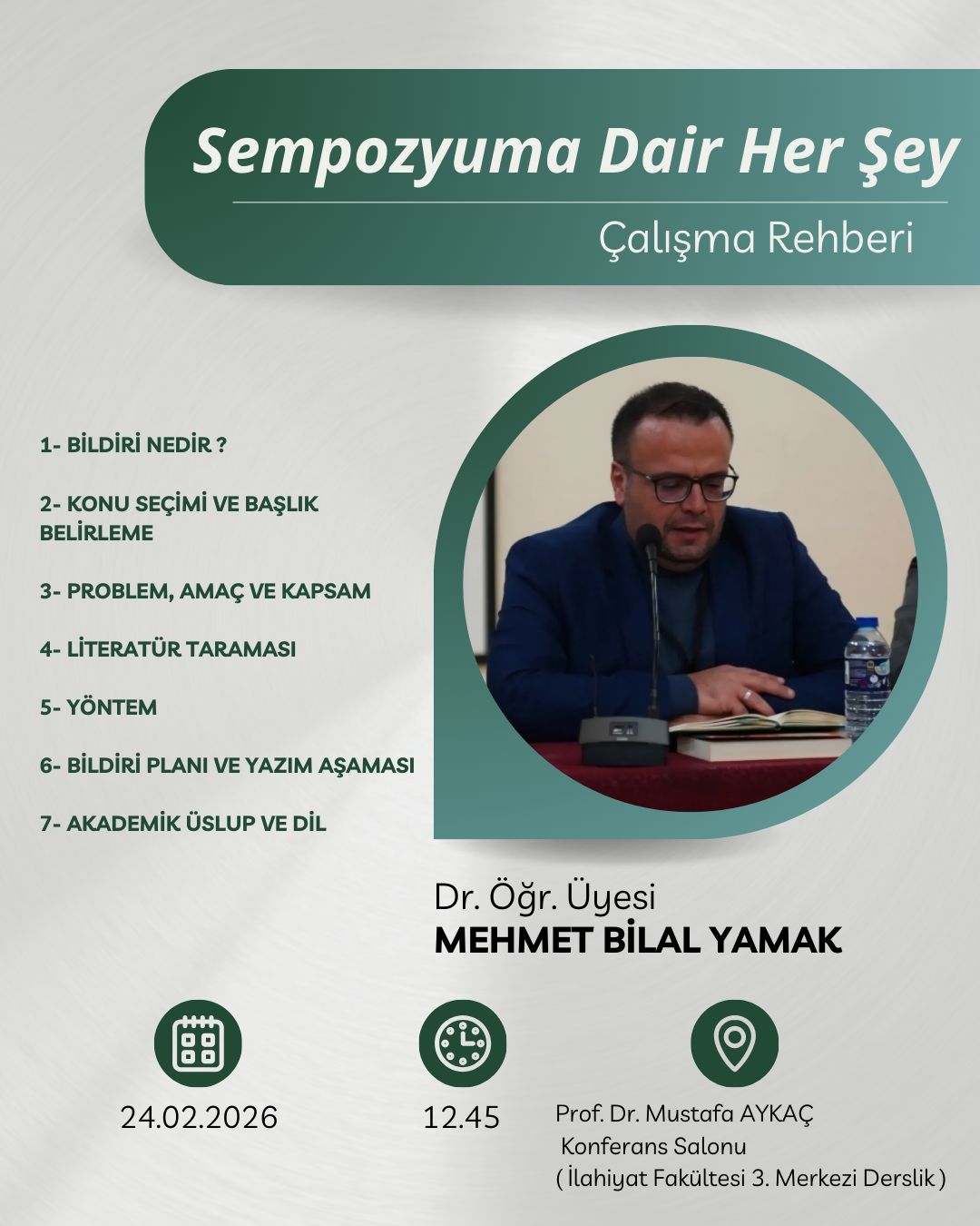 24.02.2026 tarihi saat 12.30 da Prof.Dr.Mustafa AYKAÇ Konferans salonunda Dr.Öğr.Üyesi Mehmet Bilal YAMAK'ın gerçekleştireceği ilk seminerin ana başlıkları altta sunulmuştur.